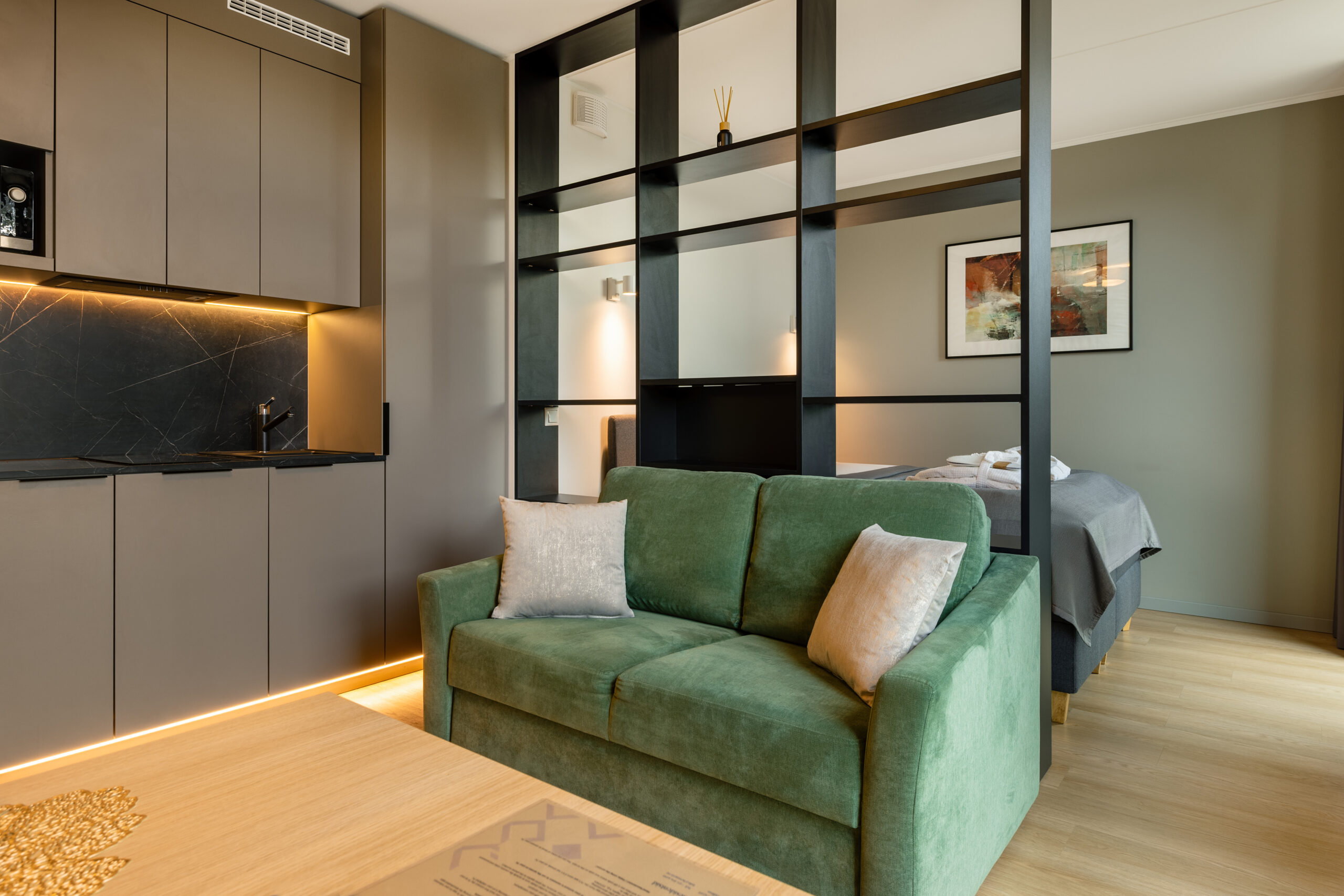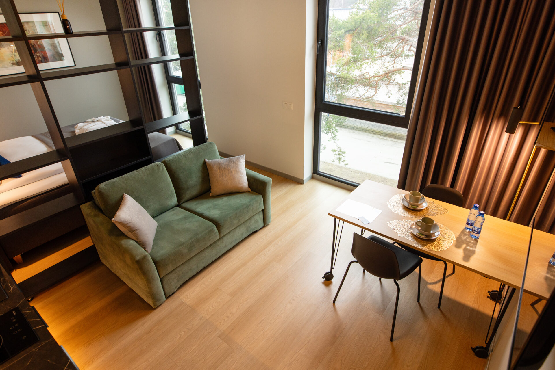 The suite offers all the essentials for a comfortable and relaxing stay, including a TV, internet access, a fully equipped kitchen, and a stylish bathroom. It is also perfectly suited for families, as the sofa bed comfortably sleeps two children. Combining space, practicality, and quality, it provides an inviting retreat for both couples and families.