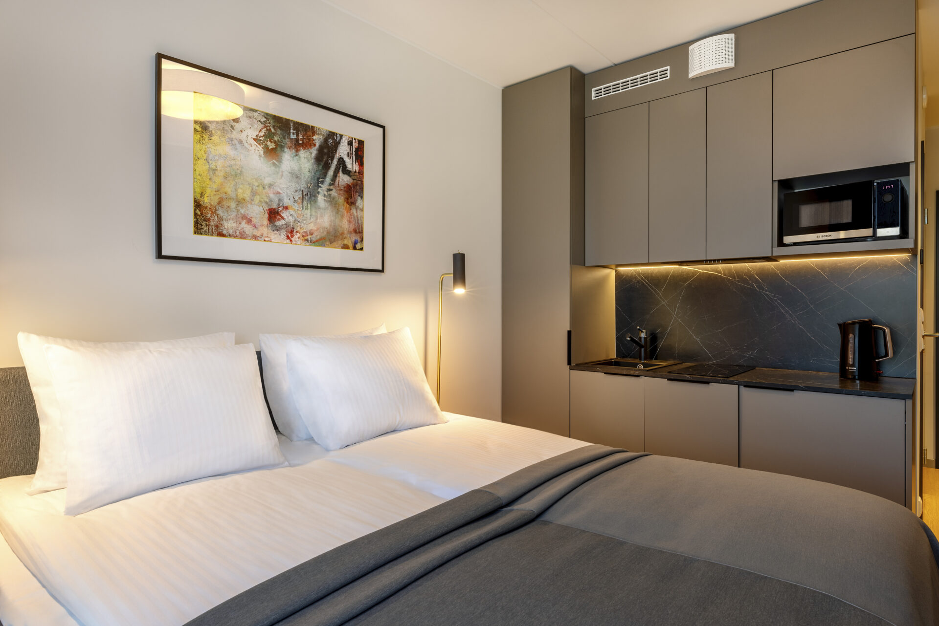 The room is available either as a Twin room with separate beds or as a Double room with one large bed. A fully equipped kitchen invites you to enjoy the art of fine dining in the comfort of your own space, while refined details add a sense of understated elegance. The spacious shower room completes the experience with modern comforts and everyday luxury.
